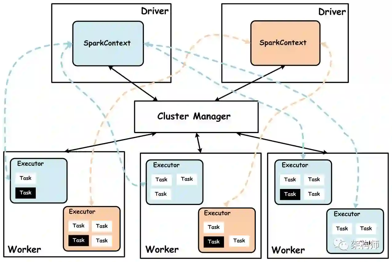 Spark集群在设计的时候,并没有在资源管理的设计上对外封闭,而是充分考虑了未来对接一些更强大的资源管理系统,如YARN、Mesos等,所以Spark架构设计将资源管理单独抽象出一层,通过这种抽象能够构建一种适合企业当前技术栈的插件式资源管理模块,从而为不同的计算场景提供不同的资源分配与调度策略。Spark集群模式架构,如下图所示: