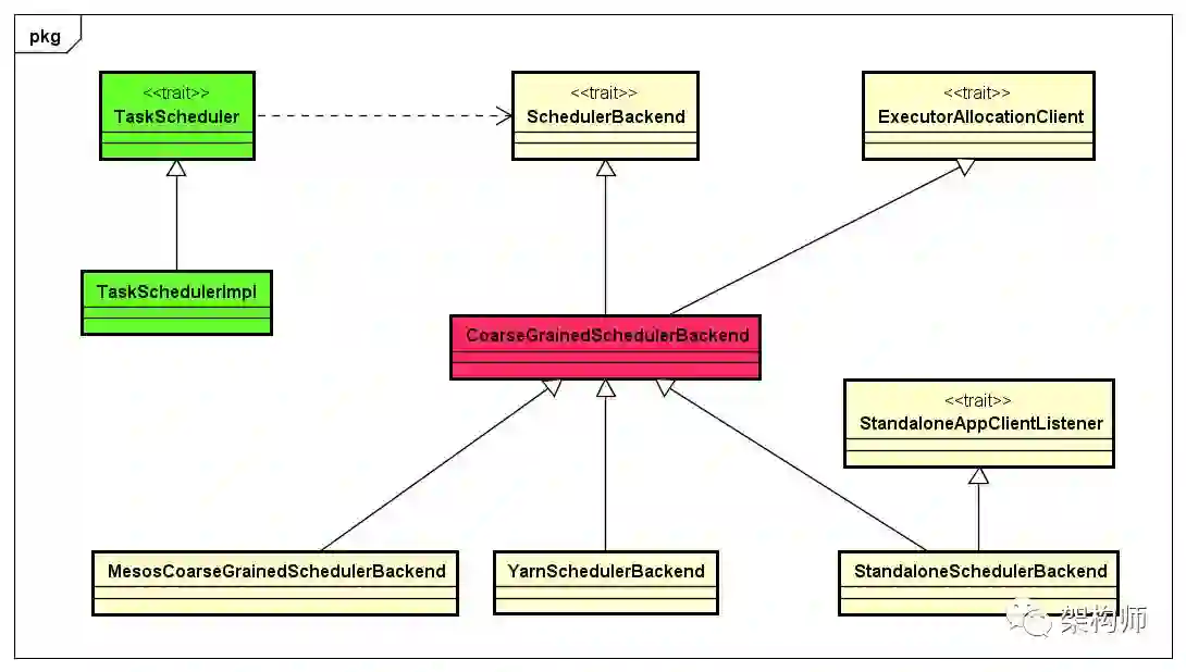 那么,Spark中是怎么考虑满足这一重要的设计决策的呢?也就是说,如何能够保证Spark非常容易的让第三方资源管理系统轻松地接入进来。我们深入到类设计的层面看一下,如下图类图所示: