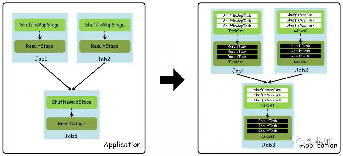 上图,为了简单,每个Job假设都很简单,并且只需要进行一次Shuffle处理,所以都对应2个Stage。实际应用中,一个Job可能包含若干个Stage,或者是一个相对复杂的Stage DAG。