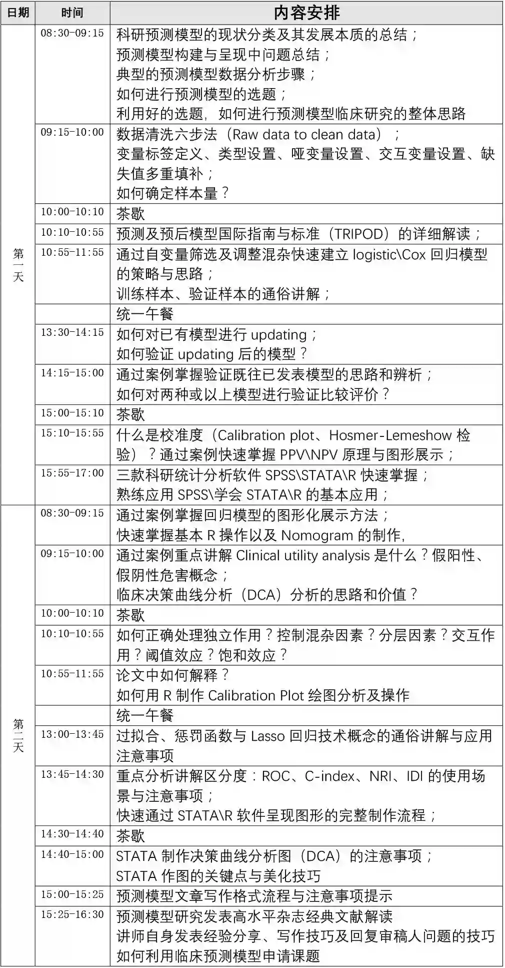 通过两天的学习,使学员掌握临床预测/预后模型的选题、数据收集、数据清洗、统计建模、模型验证、撰写方法、投稿及应对审稿人问题,最终可以独立完成临床预测/预后模型课题研究和论文撰写发表的能力。