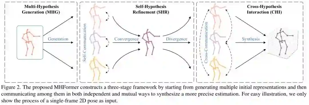这篇文章的核心思想是通过学习多重姿态假设的时空表示来合成更准确的三维姿态。为了实现这一点,作者提出了一个三阶段框架,叫多假设Transformer(Multi-Hypothesis Transformer,MHFormer)。如图2所示,该框架从生成多个初始表示开始,逐渐在它们之间进行通信以合成更准确的估计。该框架可以有效地建模多假设的依赖,并在假设特征之间建立牢固的联系。