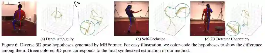 作者还给出了一些中间假设姿态可视化的结果。可见在一些具有深度模糊、自遮挡和 2D 检测器不确定性的歧义身体部位,MHFormer可以生成多个合理的3D姿态解,并通过聚合多假设信息合成的最终结果更加合理和精准。