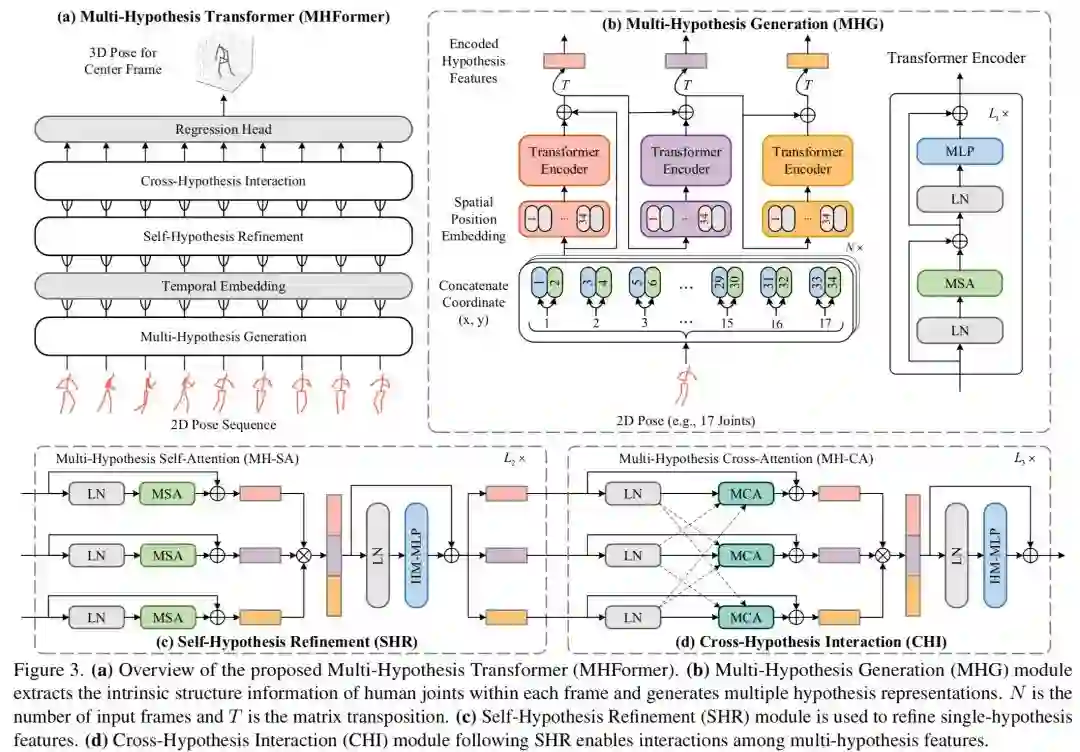 以下这张图是本文的具体网络结构。这张图很大,但还是挺好理解的。左上角的图a是MHFormer的整体框架。输入是二维姿态序列,输出是中间帧的三维姿态。MHFormer总共包括三个主要模块:多假设生成器(右上角图b),自假设修正器(左下角图c),交叉假设交互器(右下角图d)和2个辅助模块:时间嵌入,回归头。
