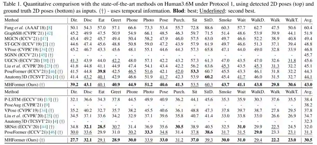从表中可见,提出的MHFormer在三维人体姿态估计最具有代表性的数据集Human3.6M上实现了SOTA的性能。作者跟大量的21年最新方法进行了对比,并在平均关键点误差(MPJPE)上超越PoseFormer(ICCV 2021) 1.3mm,3%的提升。