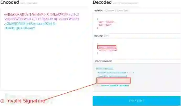 未校验签名。某些服务端并未校验 JWT 签名,所以,尝试修改 token 后直接发给服务端,查看结果。于是,我将 user 字段值从 nana 改为 admin 后,重新生成新 token:
