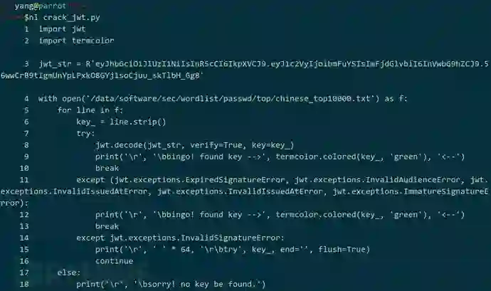 前面提到的 pyjwt 库,不仅可用于生成 JWT,也可通过 jwt.decode(jwtstr, verify=True, key=key) 进行签名校验,但,导致校验失败的因素不仅密钥错误,还可能是数据部分中预定义字段错误(如,当前时间超过 exp),也可能是 JWT 字符串格式错误等等,所以,借助 jwt.decode(jwtstr, verify=True, key=key) 验证密钥 key_: