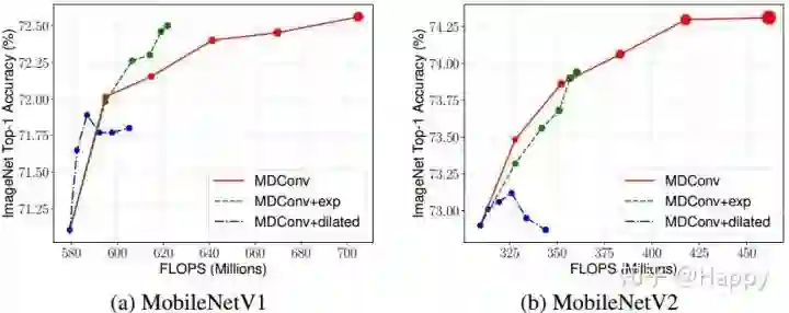 作者对比MDConv替换到MobileNetV1与MobileNetV2前后的精度对比,效果图如下。从中可以看出:相比标准深度分离卷积,MDConv更轻量、更快同时具有更高的精度