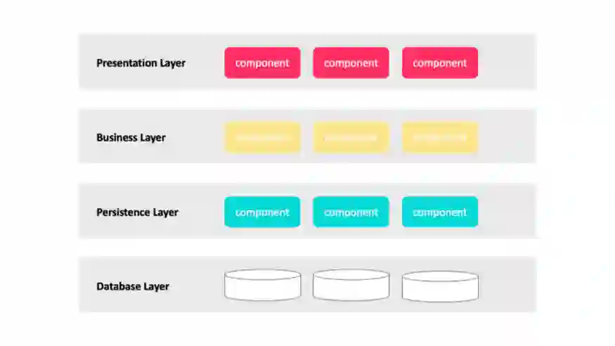 大部分软件架构师、设计师和开发者都对这个架构模式非常熟悉。尽管对于层的数量和类型没有具体限制,但大部分分层架构主要由四层组成:展现层、业务层、持久层和数据库层,如下图所示。