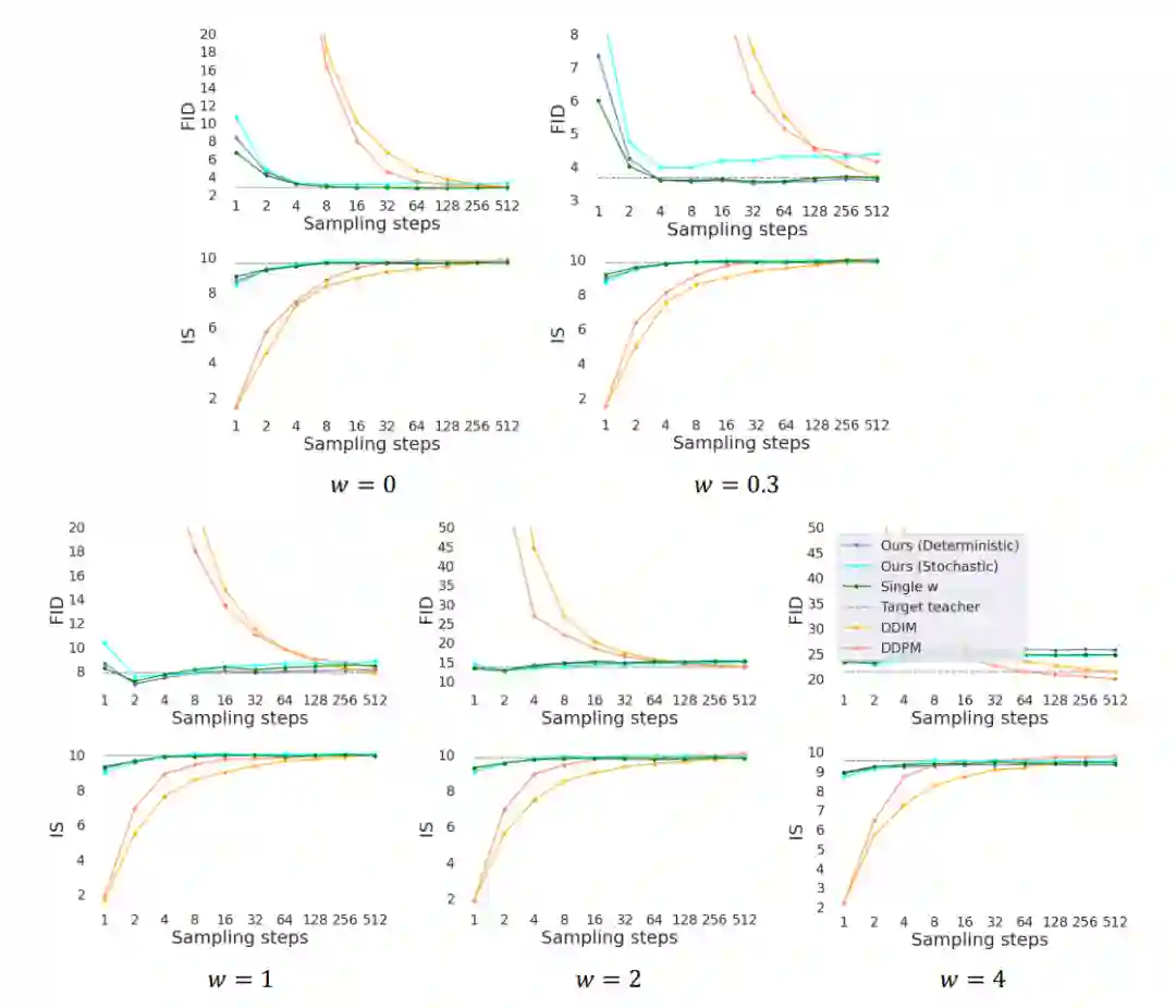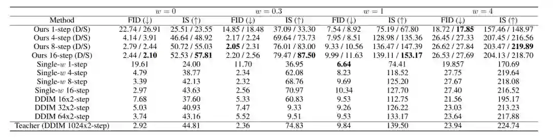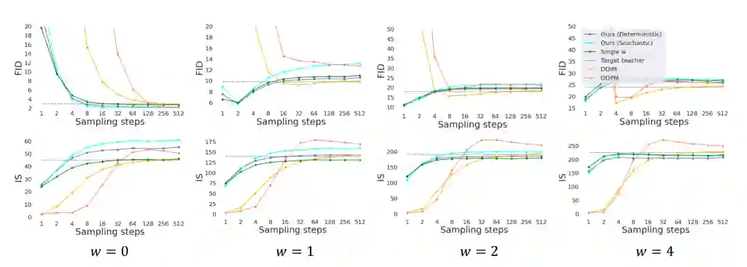 在实验中,以指导区间w∈[0, 4]为条件的模型训练,与w为固定值的模型训练表现相当。在步骤较少时,我们的方法明显优于DDIM基线性能,在8到16个步骤下基本达到教师模型的性能水平。