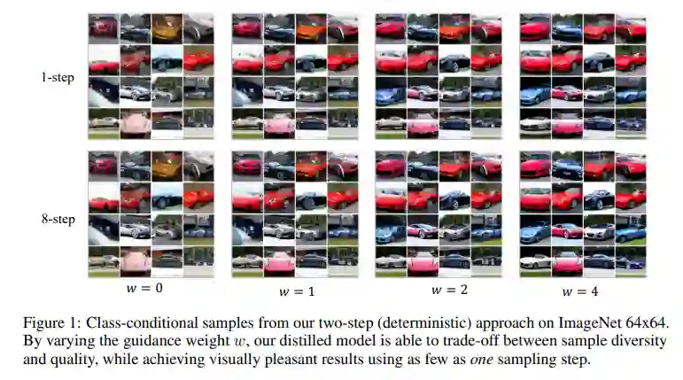 可以看到,通过改变指导权重w,研究者蒸馏的模型能够在样本多样性和质量之间进行权衡。而且只用一个取样步骤,就能获得视觉上愉悦的结果。