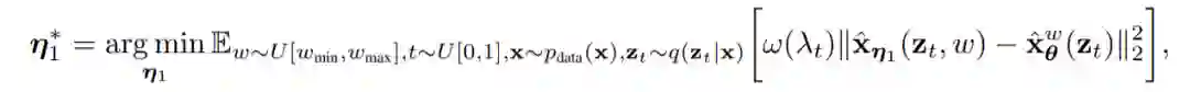 第一步,研究者引入了一个连续时间的学生模型,它具有可学习的参数η1,来匹配教师模型在任意时间步长t ∈ [0, 1] 的输出。指定一系列他们有兴趣的指导强度