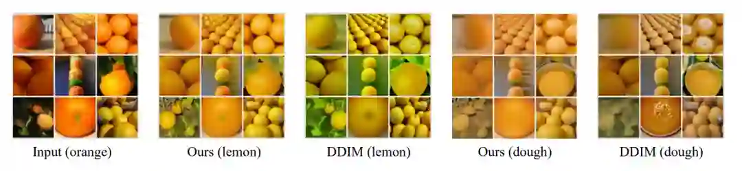 我们还对教师模型的编码过程进行蒸馏,并进行了风格转移的实验。具体来说,为了在两个领域A和B之间进行风格转换,用在领域A上训练的扩散模型对领域A的图像进行编码,然后用在领域B上训练的扩散模型进行解码。