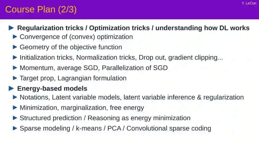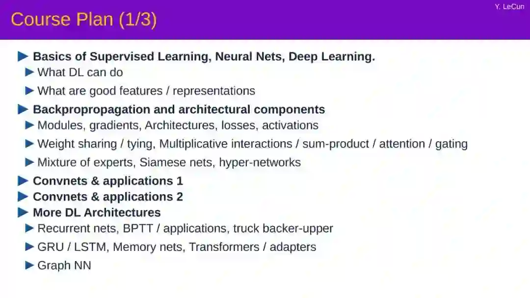 本课程涉及深度学习和表示学习的最新技术,重点是有监督和无监督的深度学习、嵌入方法、度量学习、卷积网和递归网,并应用于计算机视觉、自然语言理解和语音识别。