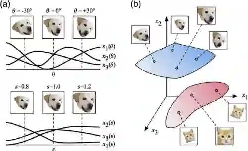 他表示,论文中的图1(下图)基本上提供了关于神经空间中“流形”概念的启发性观点。在神经空间中,我们对一只猫或狗的每个观察的方向/角度/位置变化都可以视作一个由神经元放电频率构成的平面或“流形”。图中蓝色对应为狗,粉色对应为猫。如果这两个区域没有交集,神经网络就能够分辨出猫和狗。