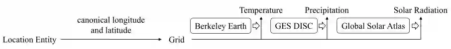 对气温、降水量、太阳辐射量,我们使用了网格数据源,数据源中地表按经纬度划分为了多个网格,每格对应了一个值。我们使用上一步得到的标准经纬度对每个地点的属性进行赋值。