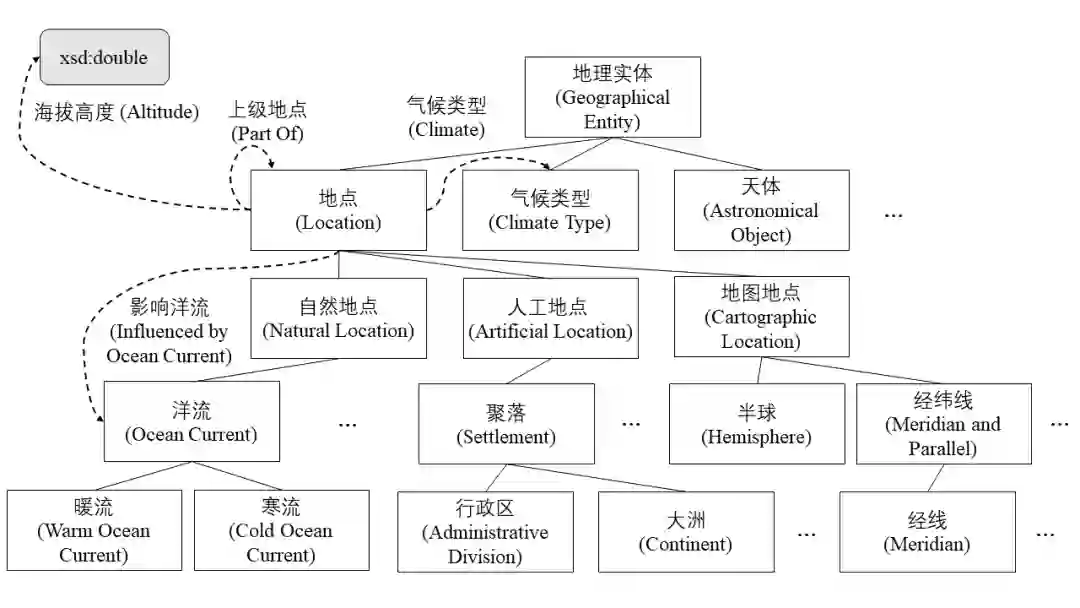 定义属性:我们将收集到的术语中的属性关联到其对应的 rdfs:domain 类型上。大多数属性的 rdfs:domain 类型为“地点”,例如海拔高度、气候类型、受洋流影响等。此外我们定义了“上级地点”属性,表述地点之间的从属关系。
