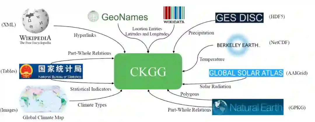 为解决高质量高中地理知识图谱缺乏的问题,我们首先从教辅资料中构建了覆盖高中地理核心概念的本体。以此为基础,我们构建了中文高中地理知识图谱 CKGG (Chinese Knowledge Graph for Geography),覆盖高中阶段的核心知识。我们基于 GeoNames 和 Wikidata 的实体合并得到了 CKGG 中的地点实体,并使用了多种工具整合了不同来源不同格式的数据。CKGG 共包含 15 亿个 RDF 三元组,120 余万实体。下图概述了 CKGG 的数据来源。
