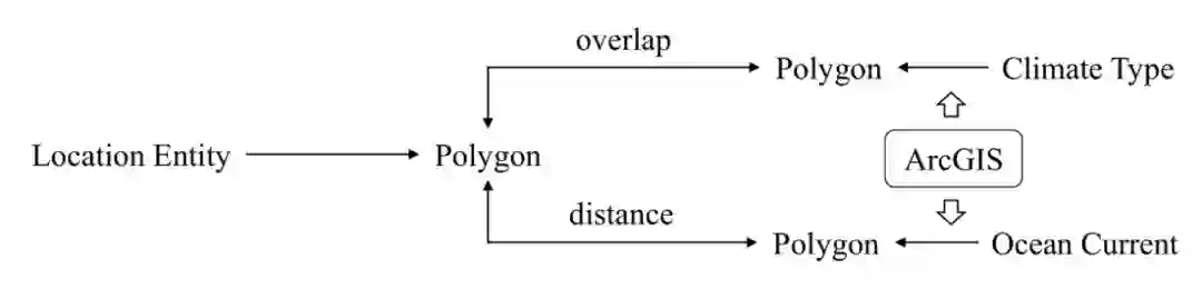 对地点的洋流、气候等数据,我们使用了 GIS 工具将书本中的气候图和 Wikipedia 中的洋流图分别标注为多边形和折线段,后根据地点与其关系得到地点的气候类型和影响地点的洋流。