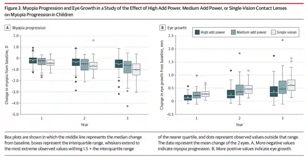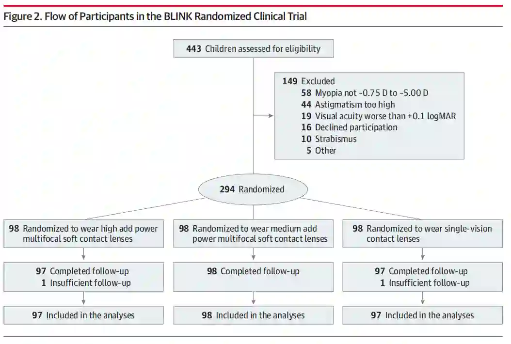 而近日,美国俄亥俄州立大学视光学院的研究人员在《美国医学会杂志》(JAMA)上发表题为:Effect of High Add Power, Medium Add Power, or Single-Vision Contact Lenses on Myopia Progression in Children The BLINK Randomized Clinical Trial 的研究论文。