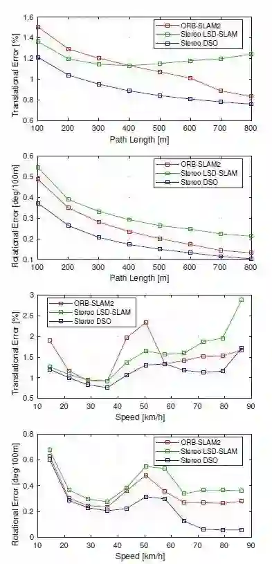图3 针对KITTI数据集上行车间距(上两张)和行车速度(下两张)的平移和旋转误差。在所有情况中,本文没有回环检测的方法都要优于带回环检测的ORBSLAM2和LSD,令人惊讶的是在大间距下该方法也能取得更好结果,而这种情况下回环通常能明显减小误差。