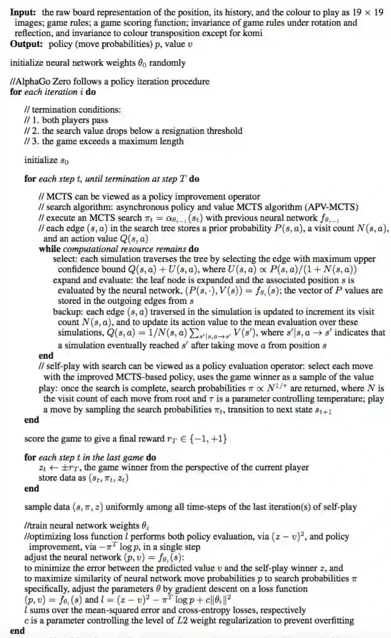 算法 1:AlphaGo Zero 训练过程的伪代码,基于 Silver et al. (2017)