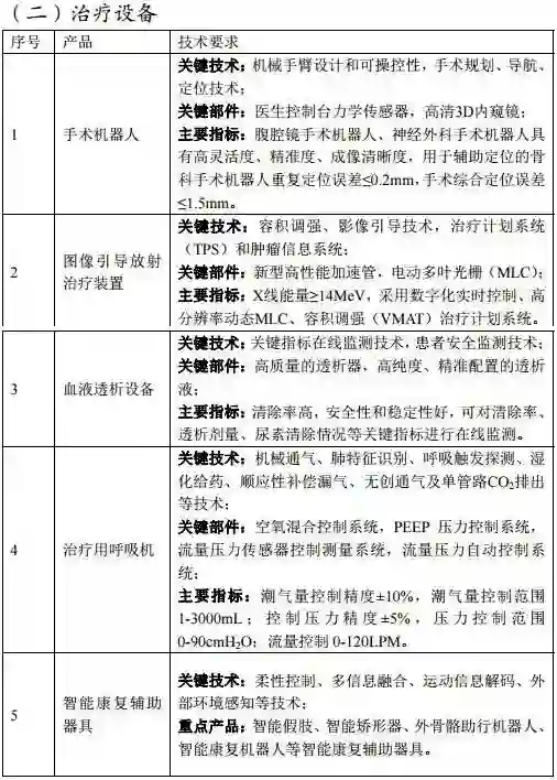 鼓励国内空白的腹腔镜手术机器人、神经外科手术机器人等创新设备产业化。推动具备一定基础的高能直线加速器及影像引导放射治疗装置、血液透析设备(含耗材)、治疗用呼吸机、骨科手术机器人、智能康复辅助器具等产品的升级换代和质量性能提升。