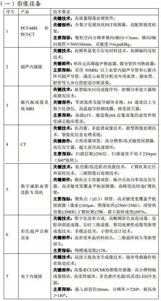 鼓励国内空白的 PET-MRI、超声内窥镜等创新设备产业化。推动具备一定基础的 PET-CT、CT、MRI、彩色超声诊断设备、电子内窥镜、数字减影血管造影 X 线机(DSA)等设备升级换代和质量性能提升。加快大热容量 X 射线球管、超导磁体、新型超声探头等核心部件及图像处理软件等核心技术的开发。