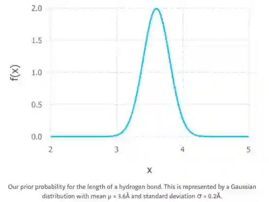 你可能需要一些时间来消化上述理论。让我们继续举个例子,在这个例子中,贝叶斯推理会派上用场。我们的例子是计算氢键(hydrogen bond)的长度。你不需要知道什么是氢键,这只是我在博士期间想出来的一个例子(因为当时我们在生物化学系,所以这个话题跟我们当时的研究很相关)。