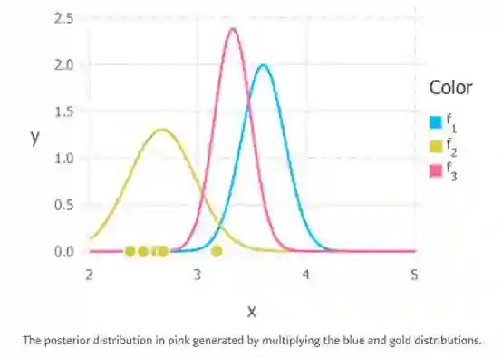 图4:蓝色和金色分布相乘后产生的粉红色曲线就是后验分布。