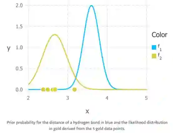 图3:从五个数据点得出的氢键距离的先验概率(蓝色表示)和5个数据点的似然分布(金色表示)