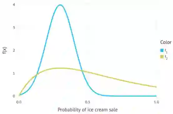 上图中的两个分布代表在任何天气中我们的先验分布。蓝色曲线和金色曲线的峰值都在0.3附近,因为我们认为0.3是最可能的先验概率(不排除其他可能性)。事实上,当横坐标不是0.3时,其取值f(x)也不为0. 蓝色曲线表示先验概率取值可能在0-0.5之间任何值,金色曲线表示先验概率取值可能是0-1之间的任何值。从图中可以看出,金色曲线比蓝色曲线更加分散,峰值也更小,这表明金色曲线的先验概率“更加不确定”。