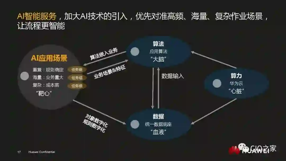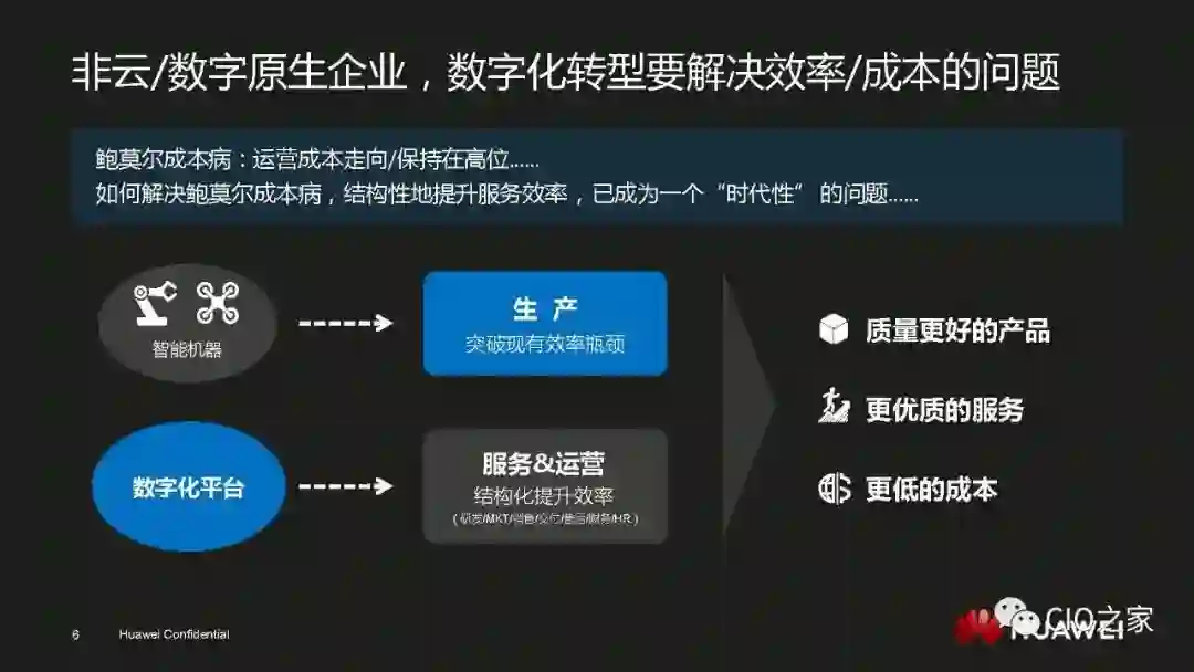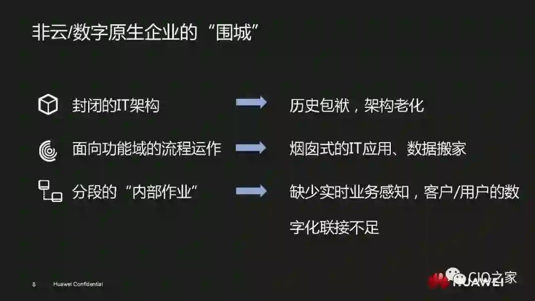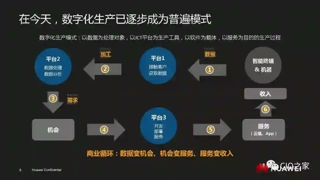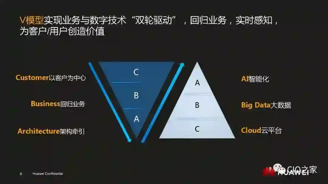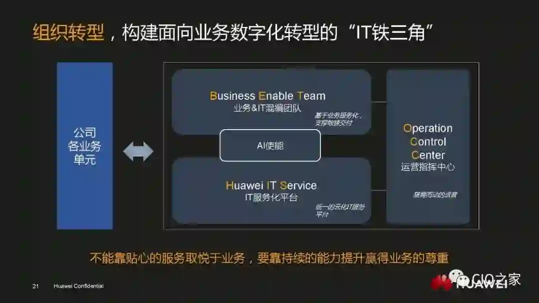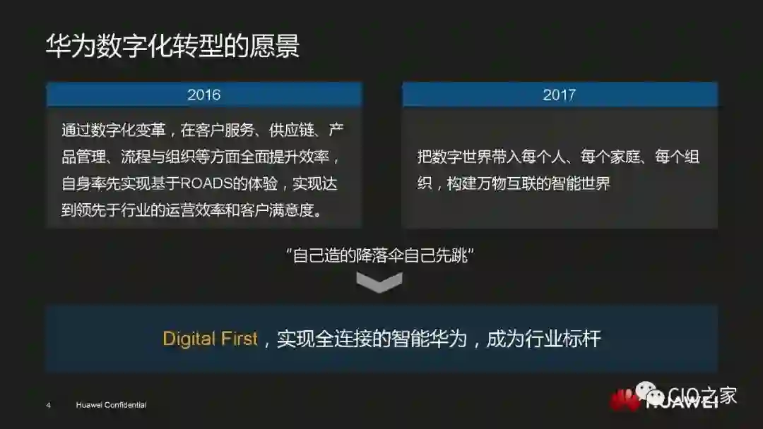 数字化转型绝不是简单的技术驱动,一定是技术和业务的双轮驱动。所以数字化转型想要顺利进行就一定要让业务主管明白其重要性和必然性,也就是要回答业务主管“为何要变”的问题。华为之所以能够在业务上取得飞速的发展,是因为华为的产品和服务在当下的环境中属于行业标杆。但基于旧有IT系统,华为是无法保持这一领先地位的,因此,数字化转型才是华为发展的必经之路。既然让用户满意度和生产效率成为行业标杆是业务主管的责任,那么推动数字化转型也同样是业务主管的职责。