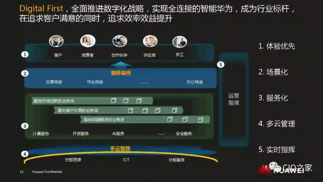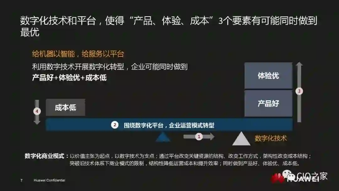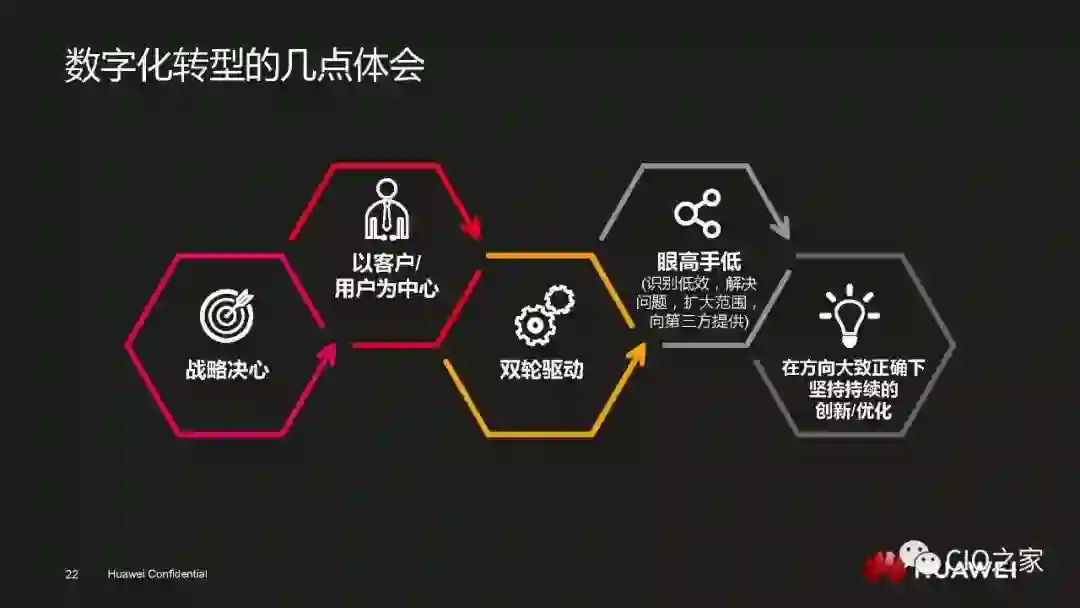 数字化转型成就今日华为数字化转型不仅提升了华为自身的IT能力,更帮助华为实现了自身管理和运营能力的升级。数字化转型需要顺势而为。华为数字化转型的核心就是以业务和技术双轮驱动,以客户和用户为中心,广泛引用先进技术改造流程。
