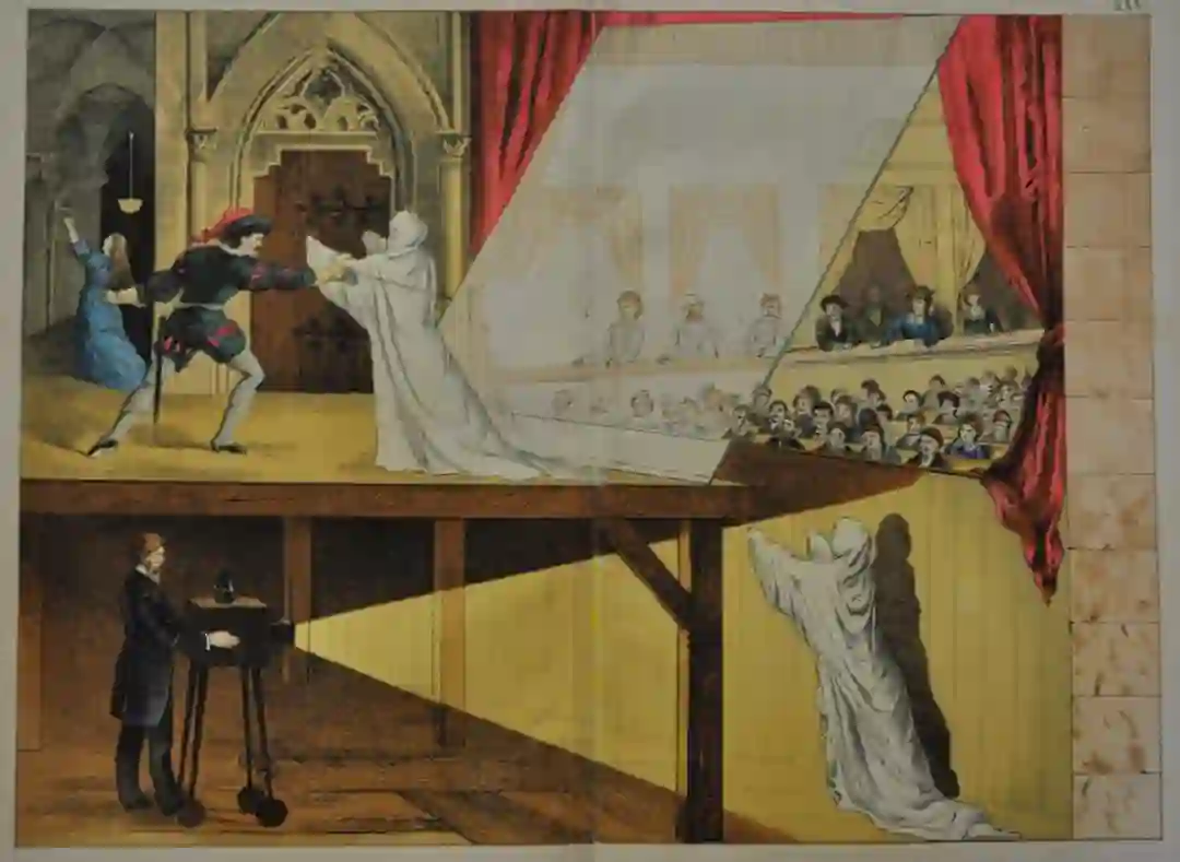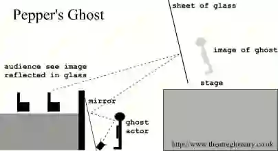 侃爷可能使用了一个维多利亚时代的把戏,叫做「佩珀的幽灵」(Pepper's Ghost) ,在舞台上用半透明的镜子来反射从放映机上传来的电影。