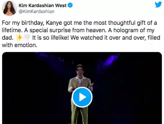 卡戴珊看后感动不已,她的父亲于2003年去世了,她形容全息图「如此逼真」,是「来自天堂的特别惊喜」。并在标题中写道:「为我的生日,坎耶送给我一生中最周到的礼物。」