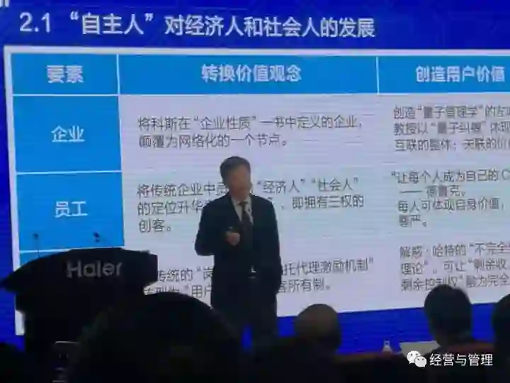 另外传统经济(时代),泰勒时代是经济人,员工来了就是为了赚钱的;后来美国管理界强调个人的社会价值,所以应该是社会人。不管经济人还是社会人,都没有解决这一个问题。为什么?社会人也是把企业变成封闭,没有办法尊重社会。现在我们的员工变成自主人,可以自主创造自己的价值。所以德鲁克说的让每个人成为自己的CEO,体现自身价值。
