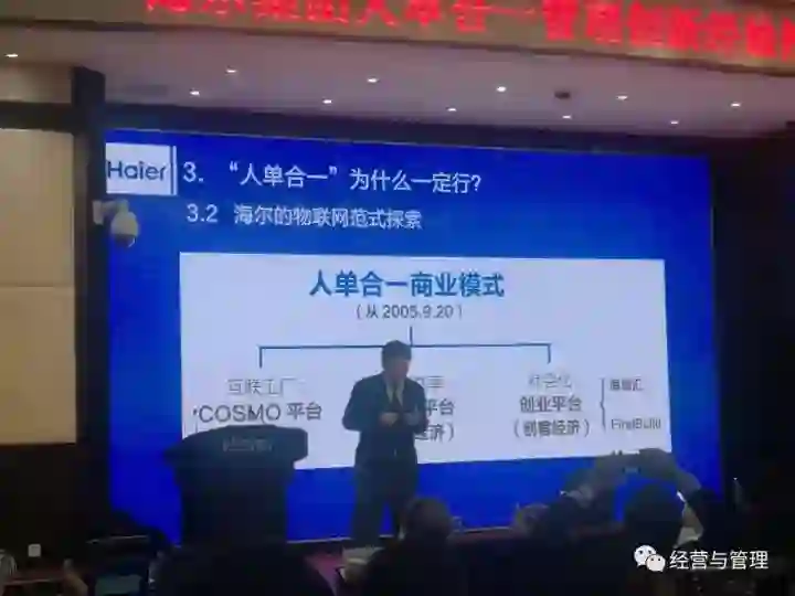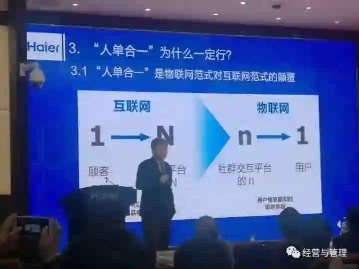 今天因时间的关系主要讲三点。第一个是,为什么一定要颠覆传统的模式;第二个就是,为什么一定是“人单合一”。我不是说“人单合一”是唯一的,但是“人单合一”一定是符合这一个方向的,因为 “人单合一”,人是员工,单不是狭义定单而是广义的,就是用户的需求。把员工和用户的需求连在一起,由员工去创造用户的价值;第三个是,“人单合一”为什么一定会在物联网时代畅通无阻。