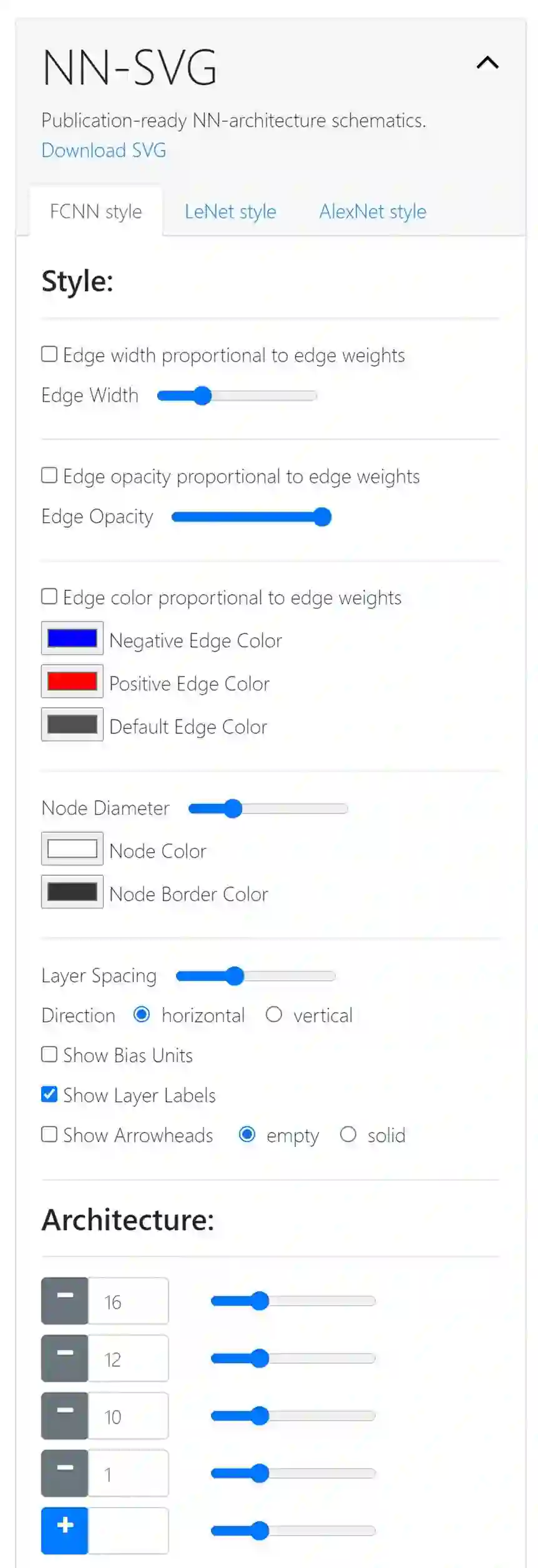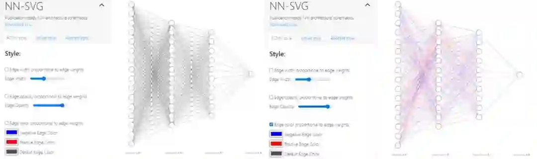 其中,前两类神经网络图形使用 JavaScript 库 D3.js 完成的,后一类由 Three.js 完成。NN-SVG 的亮点在于可以根据使用者的喜好来改变神经网络图的大小、颜色和布局参数。