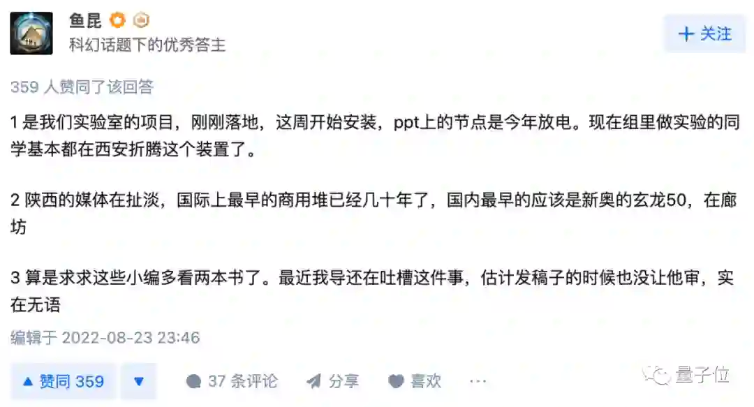 知乎@鱼昆 是实验室项目组员,他透露部件已于这周开始组装,现在组里做实验的同学基本都在西安搭建这个装置。