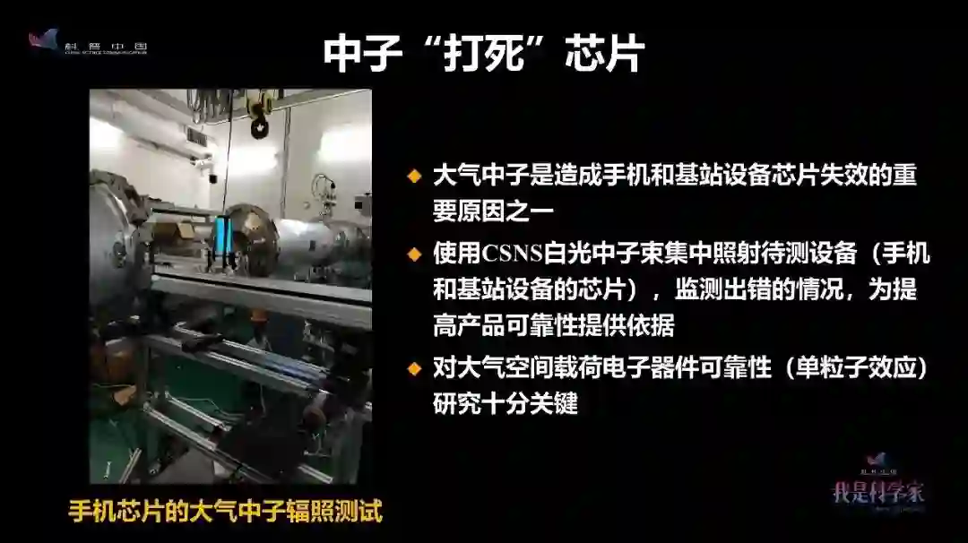 此外,还可应用于手机芯片的研究。大气中子是造成手机基站以及很多芯片服务器损坏的原因,而散裂中子源的白光中子源能够给这些芯片以及服务器提供出错的条件(我们常说的“打死”就是看它在什么条件下出错),让科学家在此条件下找出原因。同时,对大气空间载荷的器件可靠性(就是我们常说的“单粒子效应”)也有非常大的帮助。