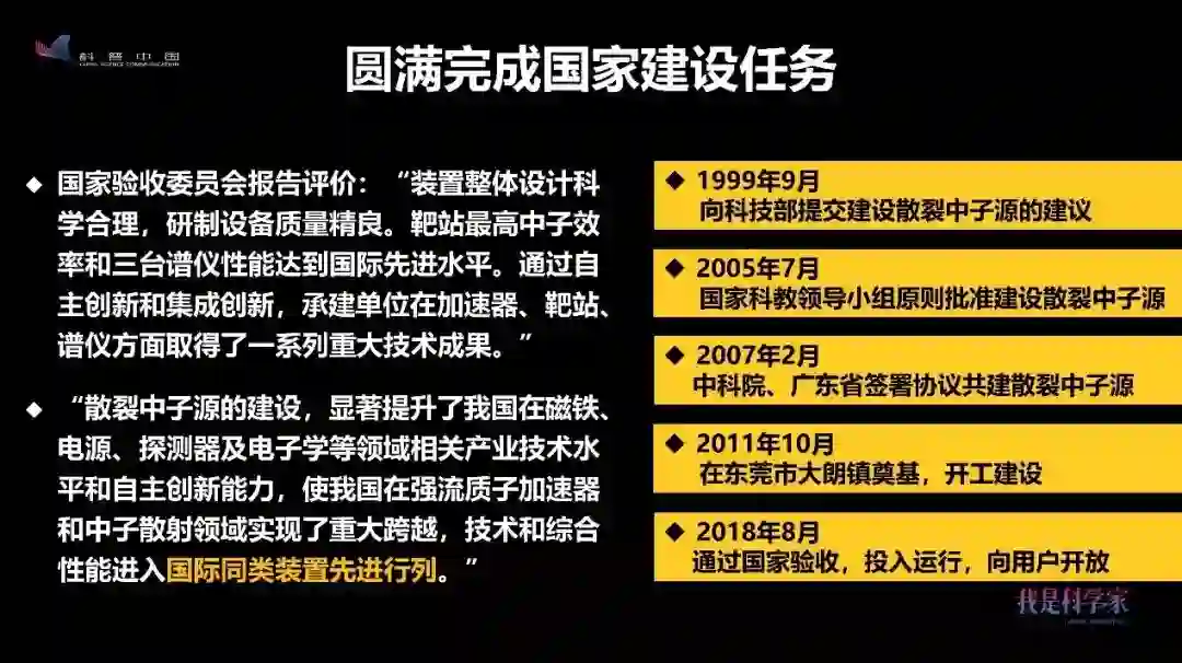 2018年8月,散裂中子源完成验收。从建设初期到现在,用了接近20年的时间。1999年,中国科学家首次提出在中国建设散裂中子源;2005年,国务院科教领导小组批准原则同意建设;2007年,中国科学院跟广东省签署共建协议;2018年,终于建成。
