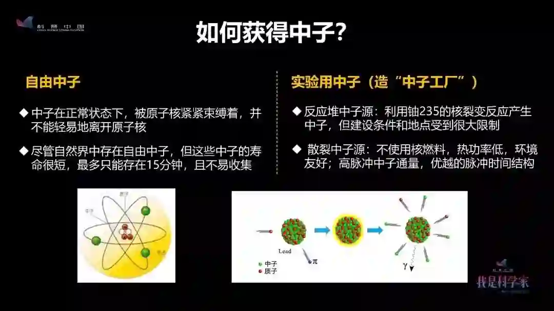 正常情况下,中子被紧紧地束缚着,不能轻易离开原子核。自由空间中虽然也有自由中子,但是寿命很短,通常只有十几分钟,不太容易收集。实验室用中子可以利用中子反应堆产生,但是受到建设地点和建设条件非常大的限制。散裂中子源能够产生优质的中子,过程中不使用核材料,热功率低,环境友好,还有高脉冲中子通量和优越的脉冲时间结构。