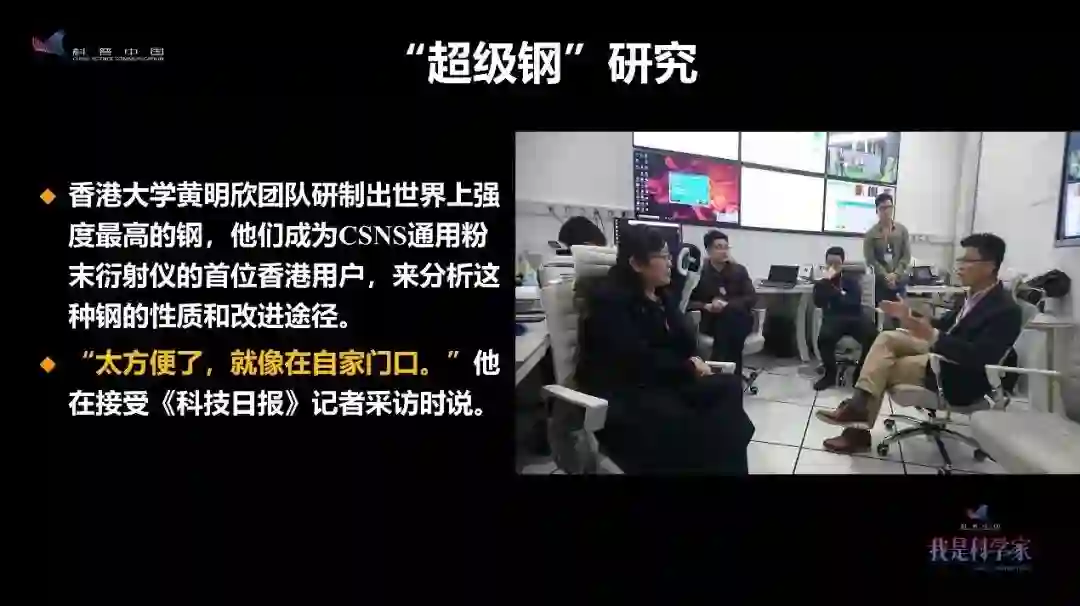 最近这几天,香港大学的黄明欣教授团队就在散裂中子源做实验(他是我们散裂中子源首批的香港用户)。他正在研制世界上最强的钢材,也就是“超级钢”。他对《科技日报》表示“太方便了,就像自己家门口”——因为他以前要做类似的实验都要到国外去,不仅很难申请到机时,条件也非常有限;而现在,他可以很频繁地进行实验。