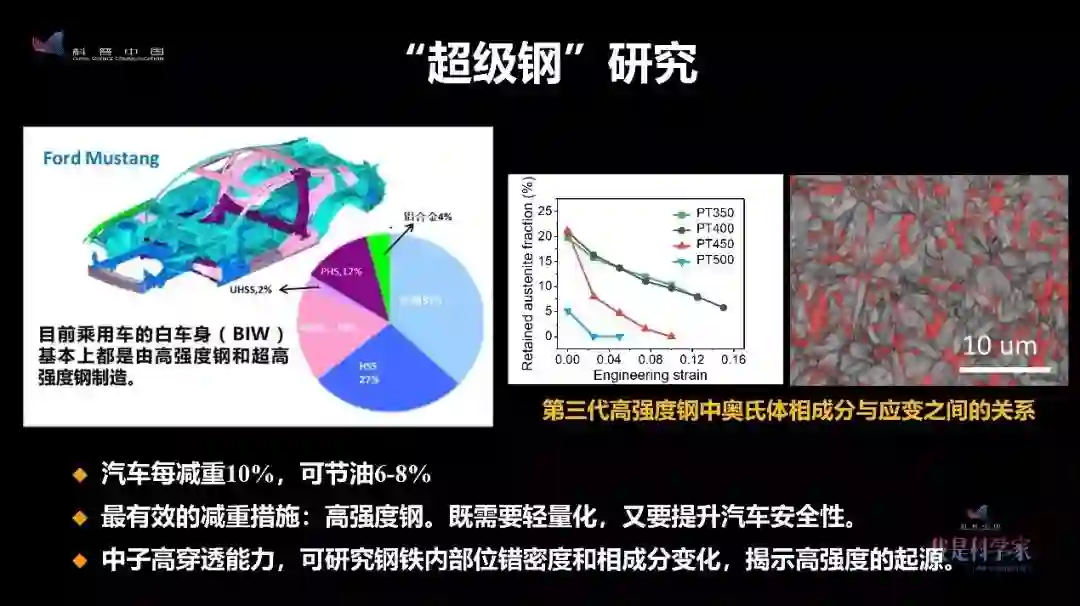 通过散裂中子源,黄明欣教授团队可以去验证“超级钢”在外力的作用下,高强度钢和超高强度钢两种物质的配比关系。有了实验依据,就可以降低钢材的重量,同时提升强度。
