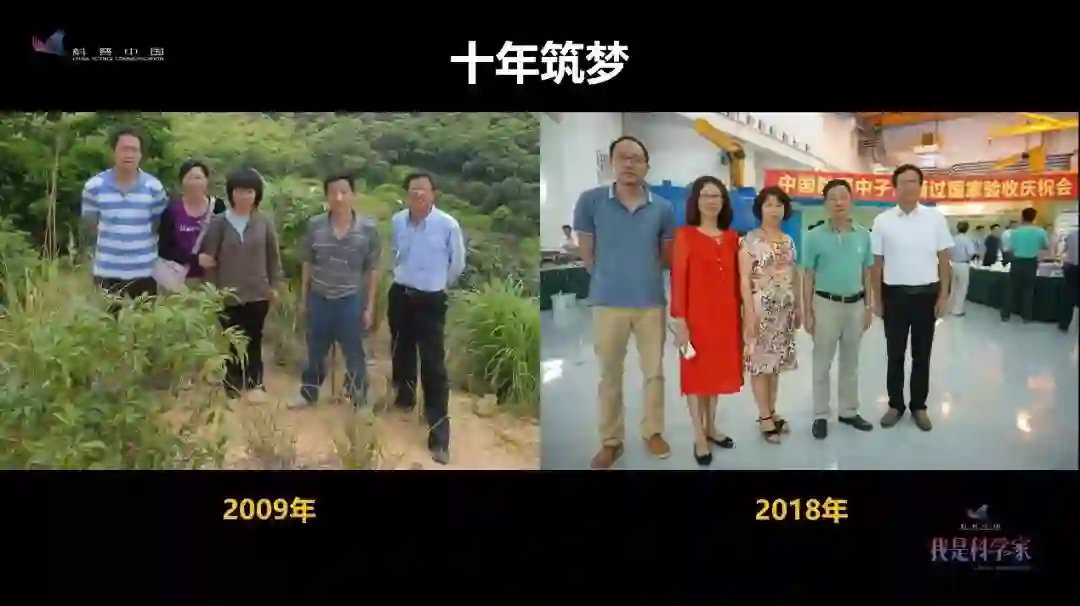2009年,我们几个先期到散裂中子源的同事在那合了一张影(图左);去年国家验收的时候,我们在同样的位置又合了一张影(图右)。两张合影的间隔接近十年,这两张合影,也是散裂中子源众多科学家和科研人员奋斗结晶的缩影。