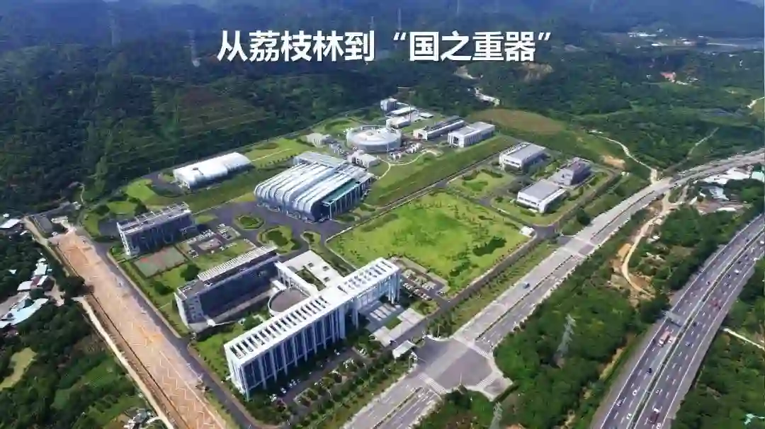 这片荔枝林,坐落在中国广东东莞大朗镇水平村,本地人说它是中国最好荔枝的出产地。也是在这片土地上,中国科学家和科技工作者经过十多年的奋斗,在这里建成了我们国家重大科技基础设施——散裂中子源,上图就是建成以后的场址。