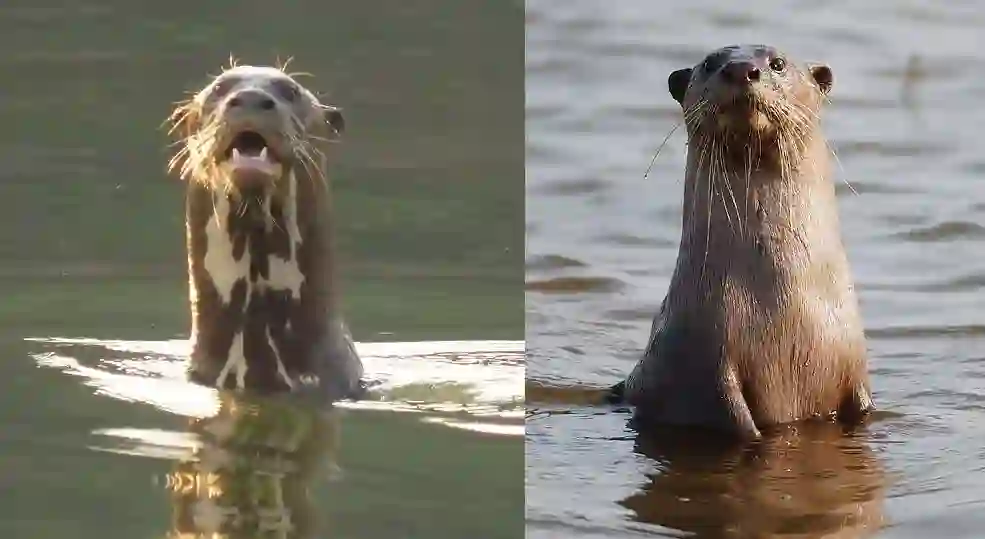 比较一下两个皮毛光滑的家伙:左边是巴西的巨獭,右边是印度的江獭 | Araguaia.org ; Yathin S Krishnappa / wikimedia