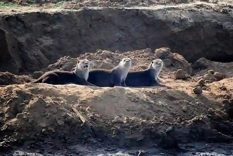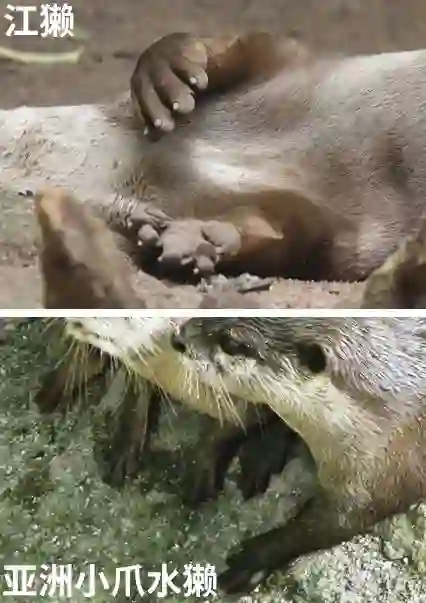 不过,走心点还是能区分的。江獭的英文名是smooth-coated otter(有不靠谱机翻为“光滑涂层水獭”),描述了它短短的、滑溜的被毛,与另一网红海獭(Enhydra lutris)总是炸着毛的样子明显不同。江獭全身光滑的程度或许只有远在南美的巨獭(Pteronura brasiliensis)能与之媲美了——除了体型更大外,巨獭喉部不规则的白斑也让人不会认错。