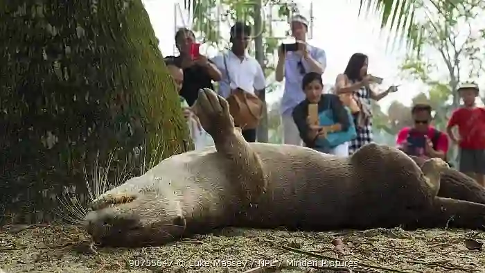 新加坡街头,一只江獭全然不知自己成为了游客镜头中的主角 | Luke Massey / NPL / mindenpictures