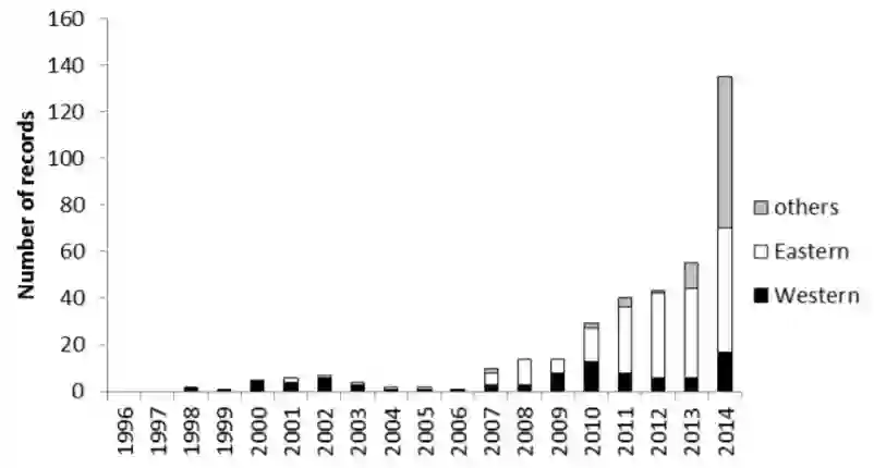 近年来新加坡的江獭数量记录:黑色代表柔佛海峡西部,白色代表柔佛东部,而灰色则代表新加坡内部和城市区域。可以看到,增量显著 | Theng & Sivasothi / IUCN OSG Bull.(2016)